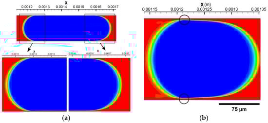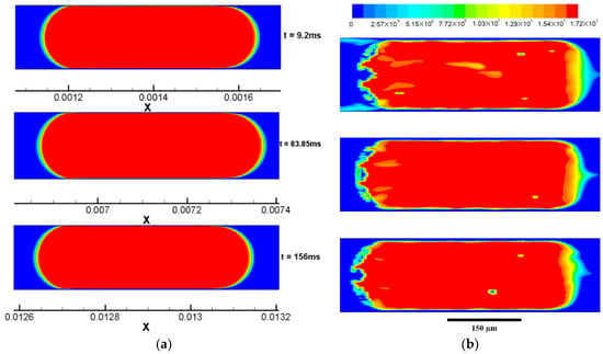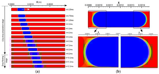 Taking Case 1 as an example, the first stage of computation for preparing a completely cylindrical profile of the drop is presented in Figure 2a. The initialized (liquid) CO2 drop is 0.3 mm from its left boundary to the channel inlet and assigned a velocity of 0.1 m/s which equals to that of water. The initial profile of this drop is a perfect quadrilateral. After 0.25 ms, the front boundary of the drop shows a bending effect, so does the back boundary with a slightly lower degree. As the computation proceeds, water films start to form at the front part of the drop near the channel wall which separate the drop from contact with the wall. The films continue to grow and extend to the back part of the drop. At t = 9.2 ms (i.e., Δt0 = 9.2 ms), a completely cylindrical profile of the CO2 drop is shaped (see Figure 2b). Both the front and back of the drop are of a meniscus shape. The drop is separated from contact with the channel wall by two thin water films, as shown by the zoom-in views in Figure 2b. The thin film thickness is measured 2~2.3 µm, i.e., 1.3~1.5% of the channel width (W). Based on the water properties in Table 2, the capillary number (Ca = µu/σ) of flowing water is 2.8 × 10−3 which results in a film thickness of ~2% W.