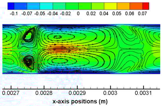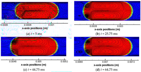Out of the drop region, water slug regions in the vicinity of the back and the front meniscus of the drop are characterized by toroidal flow streamlines too, which can be found in all of the images in Figure 4. Near either the front or the back meniscus of the drop, there exist two vortex regions in the water slug which are in opposite directions and x-axisymmetric with each other. These vortices are formed due to combined effects of the shear stress (in negative-x direction) at the near-wall region and the net bulk flow (in positive-x direction) along the channel centerline under a presence of a drop meniscus. This elucidation is further clarified by the contour of relative x-axis velocities (partly based on which the flow streamlines are plotted) as shown in Figure 5. The blue region indicates that the thin water film as well as the boundary layer region (corner regions in Figure 5) near the wall are characterized by negative relative x-axis velocities. On the other hand, within the water region and on the axis, positive relative x-axis velocities are presented which indicate net bulk flows. These findings verify that shear stresses in near-wall regions are reverse to the bulk flow which further lead to the formation of flow vortices in water slugs.
