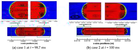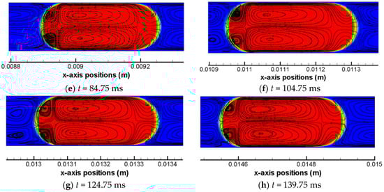 CO2 molecules are able to enter into the solvent phase (e.g., water) driven by diffusion and convection. As a consequence, the shrinkage of CO2 drop occurs, as reported previously [,]. However, it is technically challenging and demanding to experimentally probe the flow fields within droplets. An alternative is numerical simulation. Figure 4 shows the flow streamlines within the scCO2 drop and in the vicinity of the interface at the drop meniscus at eight time moments during the drop flowing stage. The streamlines are plotted in a frame of reference of the CO2 drop based on: (1) relative x-axis velocities that are calculated by subtracting the mean flow velocity (i.e., = 0.11 m/s) from computed x-axis velocities; and (2) y-axis velocities.