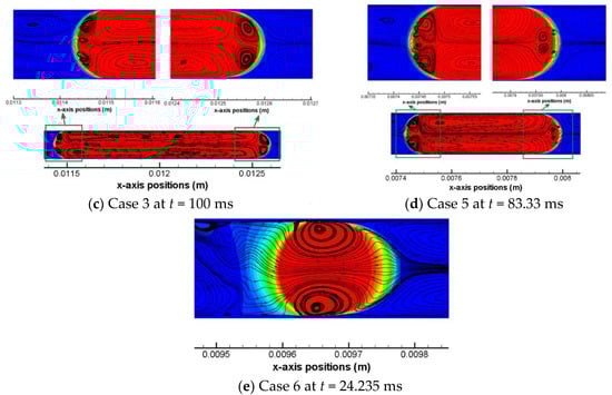 Representative pattern of flow streamlines within the CO2 drops and at the interface for all the other five cases (other than case 4), i.e., (a) Case 1; (b) Case 2; (c) Case 3; (d) Case 5; and (e) Case 6.