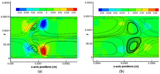 In view of a uniform pattern of flow streamlines for each simulation case, one time moment roughly during the middle of the a full computation process is chosen to present the characteristic flow streamline pattern for all cases, as shown in Figure 6. For liquid CO2 drops as shown by Figure 6a–c, a non-dimensional drop length (L0/W) has a range from 2.4 to 6.3. In addition, the capillary number of these three cases has an order of magnitude of 10−3. It is noticed that within both the front and the back meniscus of the drop there exists a pair of vortex regions, thus there are six vortex regions identified in total for these liquid CO2 drops. It is also clear that the front pair of vortex features a larger area than the back pair of vortex. Taking Case 1 as an example, y-axis velocities may be helpful to elucidate the vortex directions of the front vortex pair as well as the back vortex pair, as shown in Figure 7. It can be seen that across the interface there are always reverse y-axis velocities. In Figure 7a, colored small regions show a positive and a negative y-axis velocity in a neighboring domain across the meniscus. The reverse direction between these two small regions further results in a small vortex region in between of them. Note that this resulted small vortex region is still located within the CO2 drop. This inference (i.e., small vortex region in the drop meniscus resulting from the shear between inside of the drop and outside of the drop) is also applicable to the other pair of vortexes in the front meniscus domain, as that shown in Figure 7b. Based on observations from Figure 5, Figure 6 and Figure 7, it can be concluded that flow streamlines within the drop and near the interface are mainly caused by the shear including the shear stress in the thin film and that at the drop meniscus.