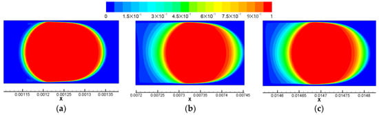 The other distinct CO2 distribution profile emerges in simulation Case 6. According to Figure 6e. There are only two vortex regions in the middle of the drop and no vortex is found in the meniscus region. This is due to the relative small y-axis velocity compared with the x-axis velocity. As discussed in previous sections, the neglected y-axis velocity, despite some differences of it across the meniscus, is not likely to induce vortex inside the meniscus. In fact, relative x-axis velocities dominate the flow stream in the central region of the scCO2 drop. Additionally, there are very rare relative convections between water and CO2 due to the quite uniform x-axis velocity. Figure 9 shows the scCO2 drop in Case 6 at three different moments. Instead of CO2 molar concentration, the volume fraction of CO2 is utilized to identify the scCO2 drop. As soon as the scCO2 drop is prepared during the first stage of the computation, the diffusive ring surrounding the scCO2 drop is quite thin. However, as computation continues, the diffusive ring becomes wider over the x-dimension. Also, significant wide regions of volume fraction gradients at the front and the back meniscus of the drop can be observed, as shown in Figure 9b,c. The unidirectional gradient indicates that diffusion may be the only effective transport mechanism for CO2 into water as scCO2 drop moves at a very high velocity. This diffusion-only scenario can be comprehended based on above discussions about the involved flow streamlines. As now, relative x-axis velocities override the difference of y-axis velocities, resulting in no formations of vortex in the meniscus region of the drop. On the other hand, the dominant x-axis velocity is so uniform that any significant relative convections between water and CO2 do not exist. Thus, the effects of convection become subtle in a relative sense and diffusion becomes the only effective mechanism of CO2 transfer into water.