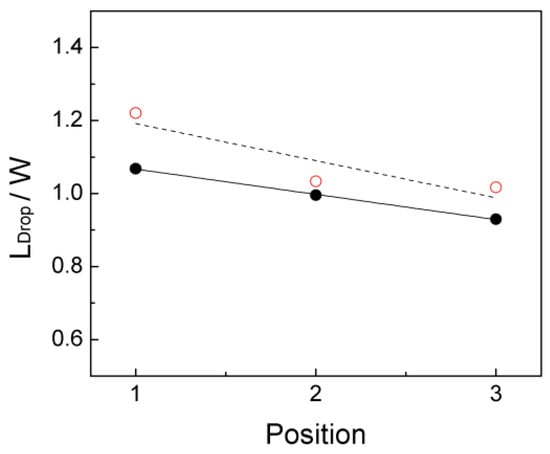 According to Figure 9, the length (Ldrop,x) of scCO2 drop at these three time moments are determined based on a nominal drop defined by a 0.5 cut-off volume fraction. The decreasing length demonstrates the shrinkage of this scCO2 drop over time. The computed drop length is first normalized by the channel width (W = 150 µm) and is then compared to the experimental result in the case QCO2/QH2O = 50/280, as presented in Figure 10. Generally, the simulated drop length overestimate the experimental drop length. However, the decreasing tendency over time is well predicted. Note that the first drop length in the simulation originates from the drop initialization in which an initialized drop length is referred to the experimental drop length and is applied in our simulation. If the computed scCO2 drop length is precisely predicted, it may enhance the predication further.