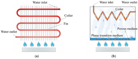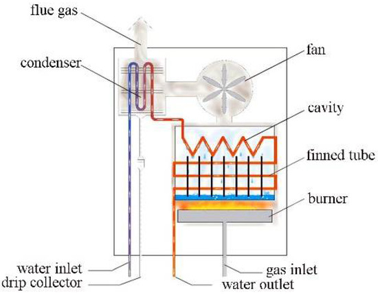 The main way to improve the efficiency of the gas water heater is to add an additional heat exchanger to grasp the heat of the exhausted flue gas and the latent heat of water vapor [13], which has been widely used by water heater producers like A.O. Smith and Ariston. This kind of heaters is called a condensing water heater, which consumes about 30% less energy than a traditional heater [14]. The efficiency of the condensing water heater is 21.1~28.7% higher than that of a traditional one [15]. Although the addition of condensing heat exchangers at the flue gas outlet can further utilize a small amount of water vapor that is generated by flue gas combustion, low temperature corrosion often occurs on the finned tube and causes a reduction of the thermal efficiency of the heat exchangers [16,17,18,19,20].