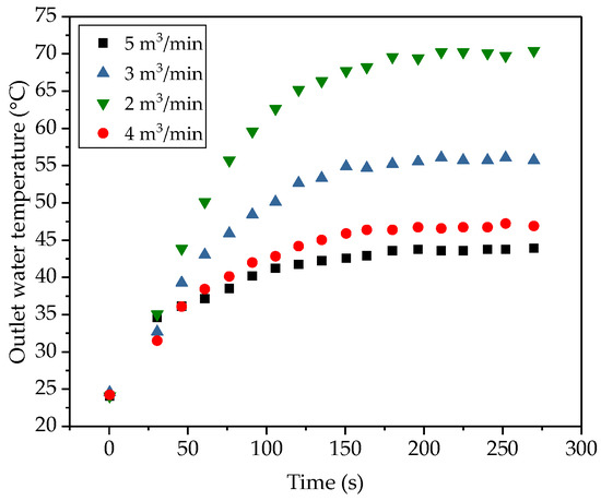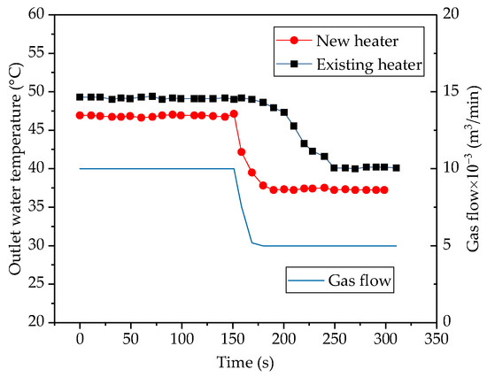 Additionally, an experiment testing the sensitivity about temperature change of the two heat exchangers. The flow of the gas will have a sudden change from 0.01 m3/min to 0.005 m3/min, and there is a significant difference of water temperature change between the two heat exchangers (see in Figure 9). When gas flow decreased, the outlet water temperature of the existing heat exchanger goes down immediately and reaches steady condition in 20 s, while the water temperature of the new one decreases slowly and stabilized in 70 s.