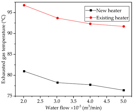 The flue gas temperature of the two heat exchanger is investigated and is shown in Figure 8. The exhaust gas temperature of the new heat exchanger varies form 81 °C to 76 °C, while that of the existing one is from 97 °C to 92 °C. It is found that exhaust gas temperature of the new heat exchanger is approximate 16 °C lower than existing one, and both of the exchangers’ exhaust gas temperature decrease with the increase of water flow.