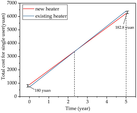 where pg is price of natural gas, yuan/m3. n is number of heaters. d is working days. For a single family water flow is 5.676 × 10−3 m3/min, temperature rise is 25 °C. Heat value of natural gas is 36,533 kJ/kg and the price of natural gas is 2.8 Yuan/m3. Assuming that the gas water heater works one hour a day. The fixed cost of the heat exchanger of new heater is about 900 yuan, while the existing one is 720 yuan from gas heater producer Ariston. The total cost of the two heaters is shown in Figure 10 and it can be found that the cost would be equal when it is about 2.5 years.