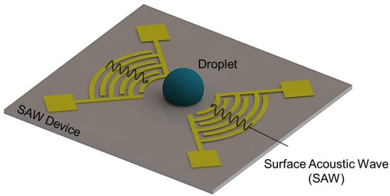 - Franke, T.; Abate, A.R.; Weitz, D.A.; Wixforth, A. Surface acoustic wave (SAW) directed droplet flow in microfluidics for PDMS devices. Lab Chip 2009, 9, 2625–2627. [Google Scholar] [CrossRef] [PubMed]