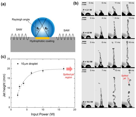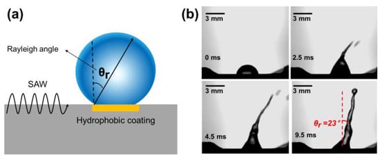 - Darmawan, M.; Byun, D. Focused surface acoustic wave induced jet formation on superhydrophobic surfaces. Microfluid. Nanofluid. 2015, 18, 1107–1114. [Google Scholar] [CrossRef]