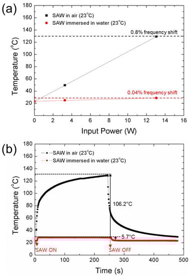 - Kondoh, J.; Shimizu, N.; Matsui, Y.; Sugimoto, M.; Shiokawa, S. Development of temperature-control system for liquid droplet using surface acoustic wave devices. Sens. Actuators A Phys. 2009, 149, 292–297. [Google Scholar] [CrossRef]