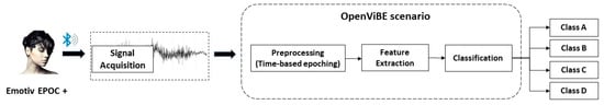 The OpenViBE BCI software (2.1.0, Rennes Cedex, France) [25] and the data acquired from the Emotiv EPOC+ device are used for the proposed approach. The EEG recordings are acquired, transmitted and stored to a local personal computer. Then, the OpenViBE platform is used for feature extraction. The signal is initially segmented in epochs of 1 s with 0.5 s overlap and 11 significant features are extracted from each signal epoch. The feature vector is fed to an innovative classification algorithm based on Grammatical Evaluation for the classification in 4 classes and its performance was compared with the performance of several classification algorithms. Linear Discriminant Analysis embedded in OpenViBE has also been employed under a whole case scenario. The proposed approach is depicted in Figure 1.