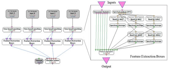 The OpenViBE is a free and open-source software platform designing to run on any ordinary Personal Computer and so to be utilized by a broad range of users. The software includes a Scenario Designer for the development of the data flow in a tree-like view and an Acquisition Server for the direct communication between the software and most common BCI devices, through the provided drivers. At the Scenario Designer a list of existing algorithms is depicted as boxes, and the user adds, connects and arranges the boxes, creating a tree-like structure for signal analysis. In Figure 2, the training scenario of the OpenViBE for the 4-class problem and the Feature Extraction box is depicted in detail.