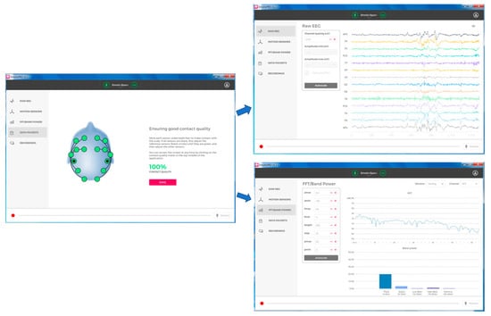 The Emotiv EPOC + EEG device is one of the most used sensory devices for EEG recording. It consists of fourteen contact points, located according to the International 10–20 system at AF3, AF4, F3, F4, F7, F8, FC5, FC6, P7, P8, T7, T8, O1, O2. Additionally, two more sensors one on the left and one on the right hemisphere of the head serve as reference channels. The sampling frequency is 128 Hz and the connection between the electrodes and the scalp is established using saline liquid solution, applied on all felt pads of each sensor. The manufacturer provides a list of software tools that implements the visualization of the quality of the connection of each sensor. The EEG data are transmitted to the computer over Bluetooth and the EmotivPRO software is the tool, wherein the quality of the connectivity is checked, and the recordings are monitored. The software interface is depicted in Figure 3.