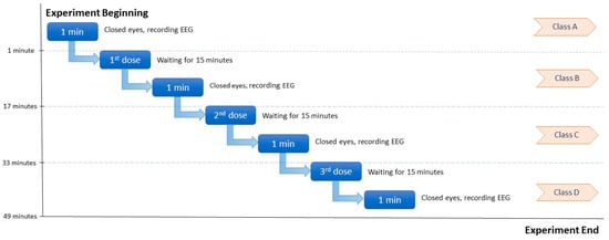 The experimental procedure was performed according to a similar protocol of previous scientific studies [16,18]. For the experiments, each dose is a drink of 50 mL of 40% alc/vol spirit (whisky). The experimental procedure consists of four stages. The Emotiv EPOC+ was placed once on the first participant according to the 10–20 International System. The device was set up according to the instructions provided by the EmotivPRO Software and the quality of the connectivity was checked. The participant was asked to remain calm in a resting state. During the first stage, the participant did not consume any alcohol and the EEG signal was recorded with his eyes closed for 1 min. Afterwards, the participant was asked to consume one dose of the spirit and wait for 15 min. According to previous scientific studies [16,18,19] a 15-min interval is appropriate to capture the EEG changes of alcohol absorption and especially for 40% alcohol-by-volume spirits, which studies have shown [29,30] that a 20% v/v spirit is absorbed faster than beer and wine. After the 15-min interval, the EEG was recorded for 1 min with the participant’s eyes closed. The same procedure was repeated in the third and the fourth stage until 150 mL of the spirit was consumed. Then, the same experiment was performed for the second participant. A schematic diagram of the experimental procedure is depicted in Figure 4.