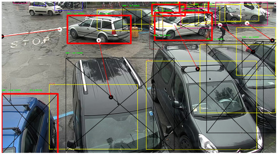 Examples of detections in the parking lot of Piazza Tasso. The yellow boxes denote annotated parking spots. The black crossed vehicles are in the parked state. The red boxes denote anomalies.
