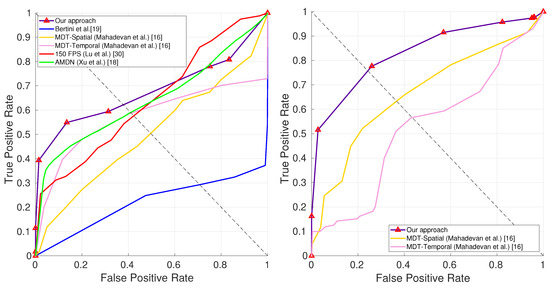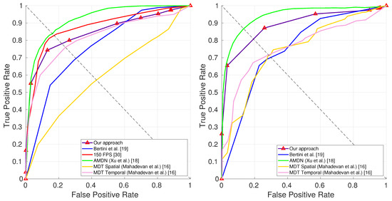 Pixel-level evaluation is a more accurate analysis of algorithm behavior. In this setting, ground truth pixel masks are available for comparison with the algorithm’s output. A detection is considered a true positive if there is at least 40% pixel overlap between the ground truth and the predicted mask. On the contrary, a detection is considered a false positive in cases where anomalies are predicted in non-anomalous frames or if the overlap with ground truth masks is lower than 40%. We show the Receiver Operating Characteristic (ROC) curves of TPR and FPR and the Rate of Detection (RD) with a varying level of system sensitivity. The system sensitivity is modified by changing the value in Equation (2).