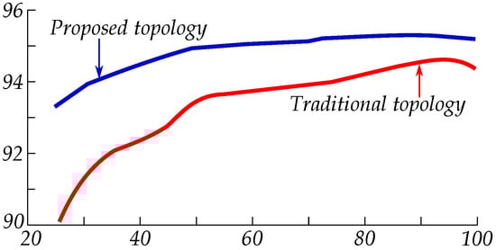 Under nominal power and nominal output voltage, from Table 1, namely V, A and V, the simulated results of the designed tandem converter and the traditional boost converter are shown in Figure 7.