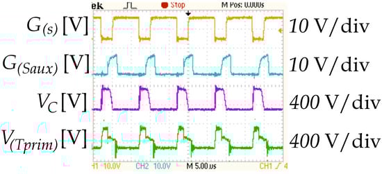 here, is the magnetization inductance of the auxiliary transformer (). For the application developed in this paper, H and V, at s. It can be seen that will be less than 1A, considering .
