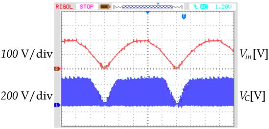 Under the stable state, the output voltage was about 400 V. The waveforms of the gate signals of switch S and and the corresponding voltage waveforms of the resonant capacitor and the primary side of the transformer during switching cycles are presented in Figure 10. The waveform of the resonant capacitor during a half line cycle is presented in Figure 11.
