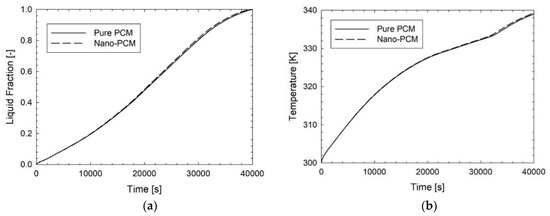Comparison of pure PCM and nano-PCM at 1% during the time in terms of (a) average liquid fraction and (b) average temperature evolution.