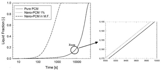 In Figure 2 there is a comparison in terms of average liquid fraction and average temperature of pure PCM and nano-PCM at 1%. During the time, it can be seen that the improvement of the nanoparticles has a small influence on the melting process because the two curves are nearly overlapped. The melting time is above 40,000 s and there is a smooth transition from solid to liquid phase during the time. In Figure 3 there is a comparison between the various improvements in terms of liquid fraction. The first important consideration is about the log scale of time, because when the metal foam is added, the melting process is very fast in a comparison of PCM or nano-PCM. The melting time for the pure PCM is 40,301 s, while for the nano-PCM it is 39,781 s. In the presence of the metal foam the melting time is 1321 s. This can be explained by the fact that the metal foam has a thermal conductivity higher than pure PCM of at least two orders of magnitude, leading a fast diffusion of heat inside the whole system reaching every point of the PCM thanks to its matrix structure. Moreover, in this figure there are three curves, but the nano-PCM and the PCM curves are overlapped because of the log scale, and the same consideration can be made in Figure 4 and Figure 5.