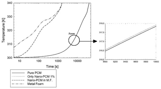 In Figure 4 it is possible to see the temperature evolution of pure PCM, only nano-PCM without metal foam, and the temperature evolution of nano-PCM in metal foam and the metal foam temperature. The curves of the pure PCM and the nano-PCM at 1% are overlapped. With the addition of metal foam, even though the melting time is very low, 1321 s compared with 39,781 s, the stored energy is lower, and after the reaching of the thermal equilibrium the stored energy is constant. This aspect depends on the lower thermal capacity of the PCM with the metal foam, which is shown better in Figure 5.