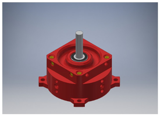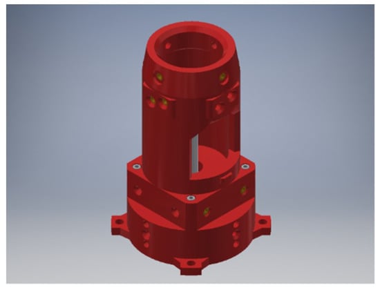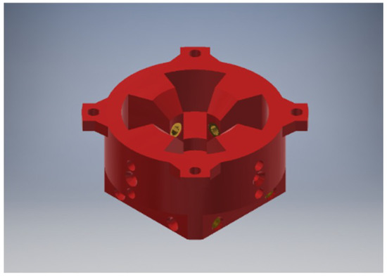 Figure 3. Rendering of base of the open-source 3-D printable pelletizer chopper. - Flip the base over and insert M3 heat inserts into the sides and top. Only insert where needed (e.g., one motor only needs one side, four motors need all sides).