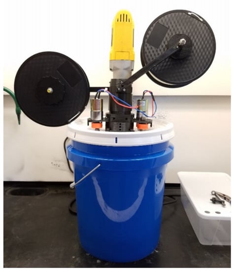 3-D printable parts were manufactured on a Lulzbot Taz 6 (Aleph Objects, Loveland, CO, USA) with 50% fill for PLA and 100% Ninjaflex (Ninjatek, St. Manheim, PA, USA). After 3-D printing all of the STLs reported in Reference [44] with a RepRap class 3-D printer from NinjaFlex (for gripping wheels) and PLA (all other parts), and purchasing the components in Table 1, assembly can begin. In order to comply with open-source hardware design guidelines, detailed assembly instructions are provided in this section. The mechanical assembly can be guided by a rendering of the major components shown in Figure 1.