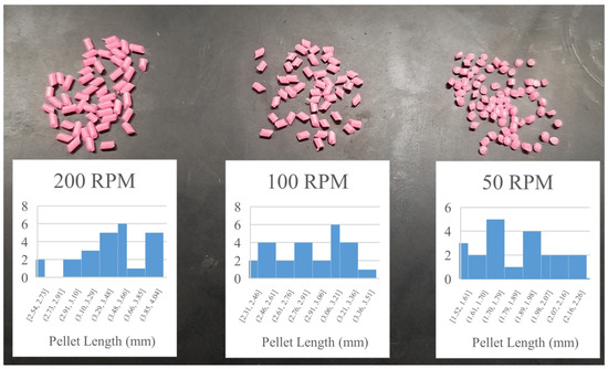 The size characteristics of the particles for each starting material as a function of drive speed from 200 to 100 to 50 rpm were quantified using digital imaging and the open-source Fiji/ImageJ [45]. The rate of pellet production (kg/h) was timed with a digital watch and determined with an electronic scale (±0.05). Electricity consumption was monitored with a multimeter (±0.005 kW·h) for each material during processing.