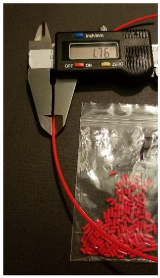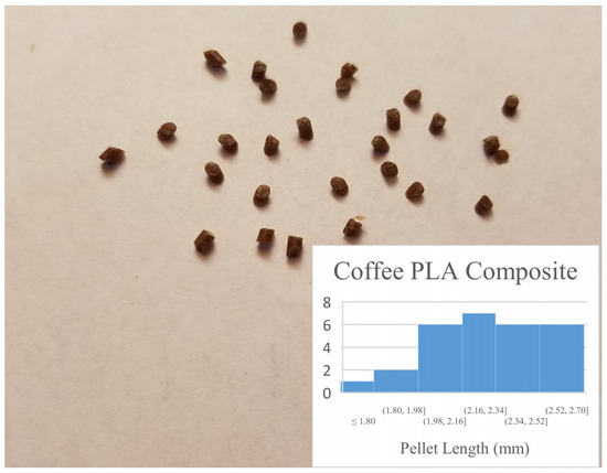 Pellets can also be made of specialty materials, as demonstrated in Figure 14 for a coffee-waste-infused PLA composite. These results provide the potential for fabricating more waste byproduct 3-D printable composites following the multistep process detailed by Pringle et al. [53]. In this process, a waste material is mixed with a thermopolymer and rough extruded once from a recyclebot, chopped, and then re-extruded to obtain a high-quality filament [53].