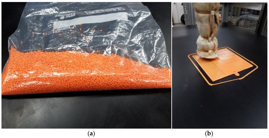 (a) PLA pellets made with the pelletizer; (b) printing with ease on the Gigabot X.