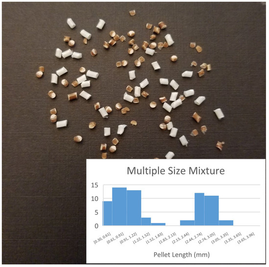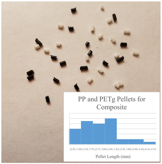 Another useful application of the device is to achieve material blends to make consumer-grade plastics such as polyethylene terephthalate (PET) and polypropylene (PP) that are acceptable as low-cost and sustainable feedstock for FFF additive manufacturing [54]. Using post-consumer waste plastic can improved the loop tightness for the circular economy [55]. This is demonstrated in Figure 18, which shows a PP and PETg dual pelletized blend ready to be formed into a composite.