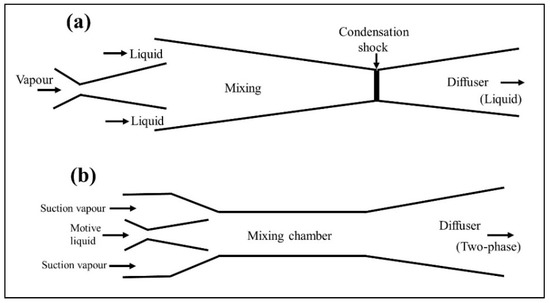 Typical geometry of two-phase ejectors: (a) vapor–liquid ejector; (b) liquid–vapor ejector.