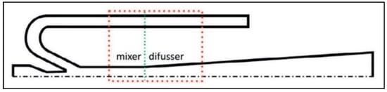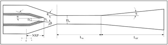In general, results about mixing length indicated that an optimization procedure might be crucial for proper ejector design. Indeed, a substantial length can result in considerable friction forces with a negative impact on the mechanism of pressure recovery, whereas a shorter length may result in an inefficient mixing of the two streams. Angles φ and η do not seem to have a systematic influence despite some cases where said influence was reported [29,39,40].