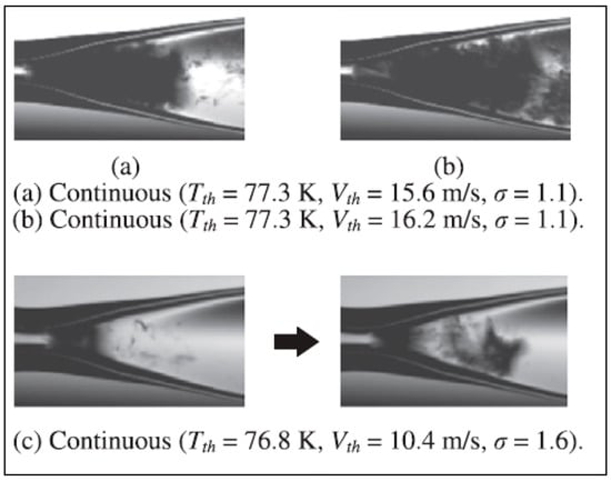 Ohira et al. [60] conducted their study on cavitation instability behavior of sub-cooled cryogenic liquid flows in a converging–diverging circular nozzle with several throat diameters (Figure 5). The working fluid was sub-cooled liquid nitrogen and the flow visualization of cavitation phenomena was undertaken at the outlet of a converging–diverging nozzle, using a high-speed video camera with imaging at a high frame rate and backlighting, so that the bubble clouds appeared as shadows.