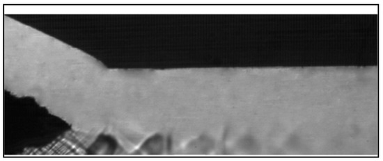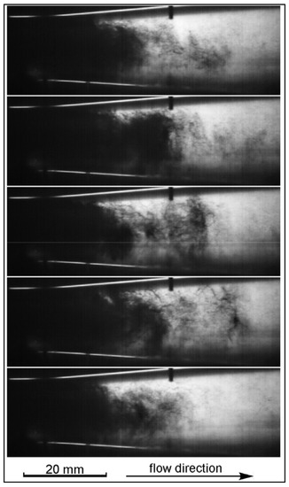 In a similar configuration as Kim et al. [61], Kwidzinski [62] investigated the condensation wave structure in a steam–water injector for validation purposes and visualized the phenomenon with a high-speed video camera. To this end, the light source was placed behind the observed flow section and the two-phase parts of the flow, which were translucent, appeared dark in the still frames (Figure 6). This recording synchronized with the measurements of pressure and temperature along the mixing chamber and diffuser walls, helped reveal the flow dynamics and the structures associated with the final stages of condensation.