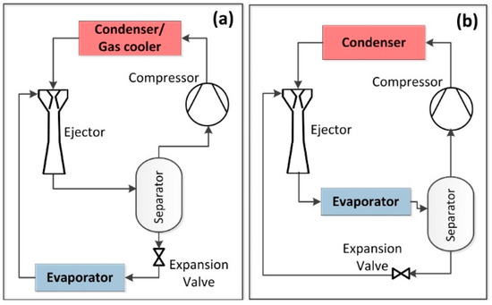 The sector of cooling, refrigeration and heat pumps seems the most promising for the two-phase ejector. In this field, the two-phase ejector is mainly used according to two approaches: ejector as an expander (Figure 8a) and ejector as a recirculator (Figure 8b).