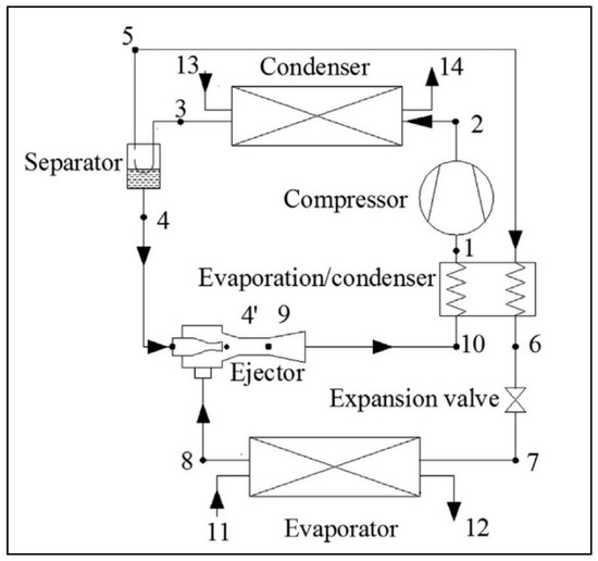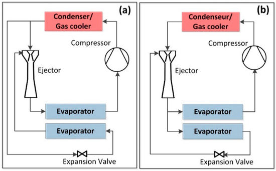 - Sarkar, J. Performance analyses of novel two-phase ejector enhanced multi-evaporator refrigeration systems. Appl. Therm. Eng. 2017, 110, 1635–1642. [Google Scholar] [CrossRef]