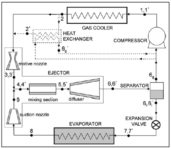 - Deng, J.; Jiang, P.; Lu, T.; Lu, W. Particular characteristics of transcritical CO2 refrigeration cycle with an ejector. Appl. Therm. Eng. 2007, 27, 381–388. [Google Scholar] [CrossRef]