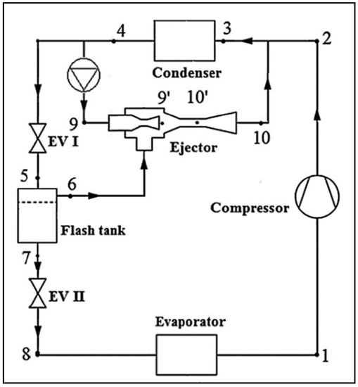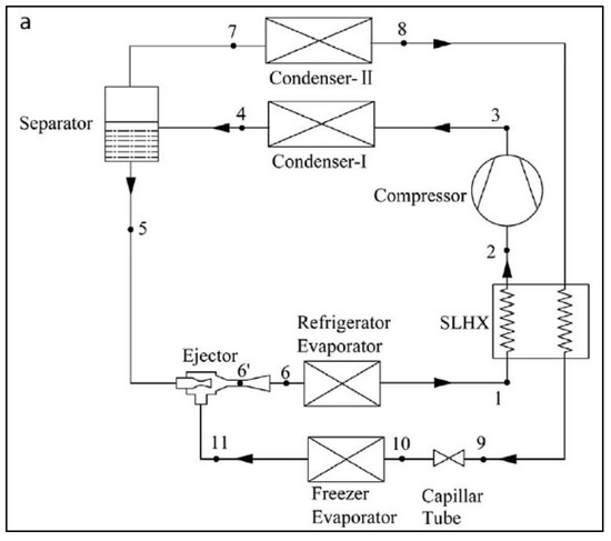- Wang, X.; Yu, J.; Zhou, M.; Lv, X. Comparative studies of ejector-expansion vapor compression refrigeration cycles for applications in domestic refrigerator-freezers. Energy 2014, 70, 635–642. [Google Scholar] [CrossRef]