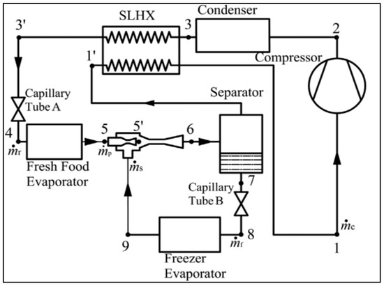 - Jeon, Y.; Kim, D.; Jung, J.; Jang, D.S.; Kim, Y. Comparative performance evaluation of conventional and condenser outlet split ejector-based domestic refrigerator-freezers using R600a. Energy 2018, 161, 1085–1095. [Google Scholar] [CrossRef]