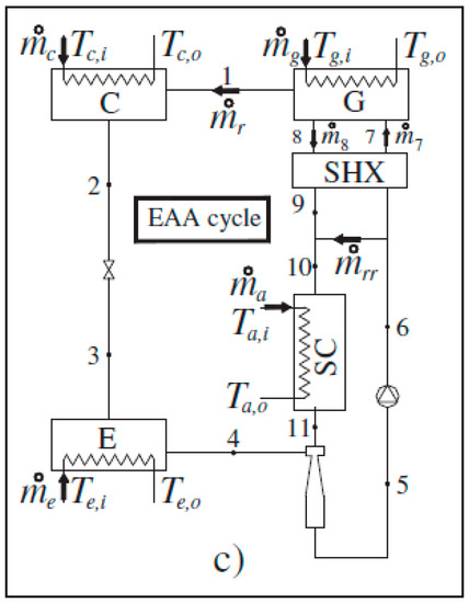 The conventional EERC (Figure 8a) was patented by Kemper in 1966 [79]. The acronym EERC refers to refrigeration, but also to air-conditioning applications and heating. Depending on the working fluid, two types of EERC cycles are reported in the published literature: subcritical cycles [30,80] and transcritical CO2 cycle [48,81]. The performances of the transcritical CO2 cycles are generally superior to the other refrigerants.