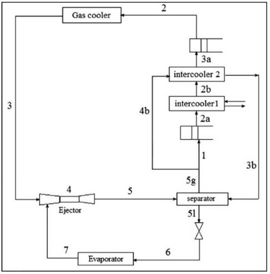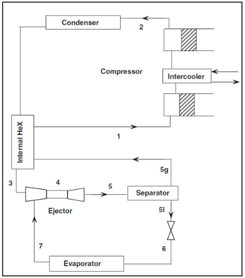 - Manjili, F.E.; Yavari, M.A. Performance of a new two-stage multi-intercooling transcritical CO2 ejector refrigeration cycle. Appl. Therm. Eng. 2012, 40, 202–209. [Google Scholar] [CrossRef]