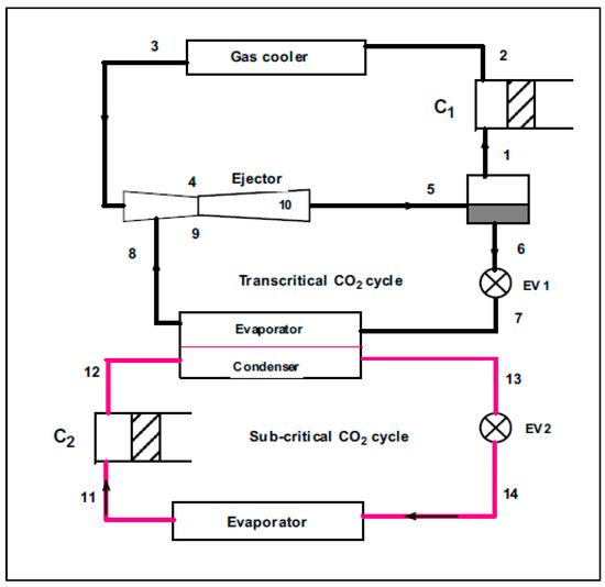 - Yari, M.; Sirousazar, M. Cycle improvements to ejector-expansion transcritical CO2 two-stage refrigeration cycle. Int. J. Energy Res. 2008, 32, 677–687. [Google Scholar] [CrossRef]