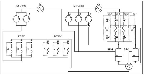 - Hafner, A.; Forsterling, S.; Banasiak, K. Multi-ejector concept for R-744 supermarket refrigeration. Int. J. Refrig. 2014, 43, 1–13. [Google Scholar] [CrossRef]
