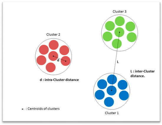 At each iteration, the k-means algorithm minimizes the intra-cluster distance (i.e., the distance between an element and the centroid of the same cluster). An illustration is shown in Figure 2. Repeating the k-means clustering several times with different initial centers leads to maximizing of the inter-cluster distance (i.e., the distance between the k centroids of clusters). Different metrics are used to calculate the minimized and maximized distances, such as Euclidian distance, Mahalanobis distance [18], Manhattan distance [19], etc. An illustration of the Lloyd’s algorithm is provided in Figure 3.