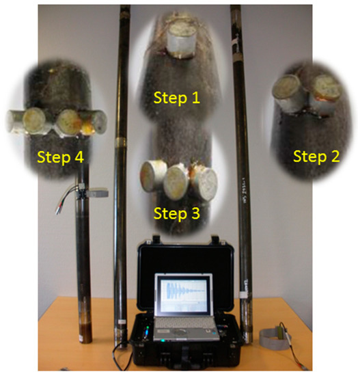 The experiments were conducted on a 2 m steel tube placed in laboratory conditions. Data acquisition was performed using a commercial system designed initially for in situ nondestructive testing of tubular structures using UGW. This system was connected to a magnetostrictive sensor [20], which was mounted on the tube. Figure 5 shows this system.
