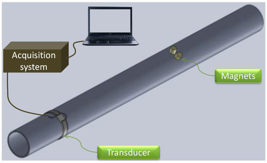 To help understand this experimental setup, a schematic diagram is shown in Figure 6. In this study, damage was simulated by attaching magnets to the structure, as shown in Figure 5. This choice was made to keep the tube safe (i.e., healthy) in order to use it in other experiments, and to repeat any previous task if the corresponding result was not satisfying. Such a method for simulating damage was applied in different research works [21,22]. Actually, defect occurrence in a structure can be geometric (i.e., local change of the shape of the structure) or material (i.e., local change of the stiffness of the material). The magnet is not used in order to induce a change in the stiffness of the steel, but to locally modify its geometry. Hence, it will not simulate a corrosion-like defect because it is not a loss of material, but another kind of defect with regard to UGW, such as a weld, pipe support, etc. By doing so, UGW will interact with such a defect. Moreover, thanks to its magnetic force, the magnet can be attached to the structure without any other tool. That is to say, the magnet can be replaced by a small piece of steel.