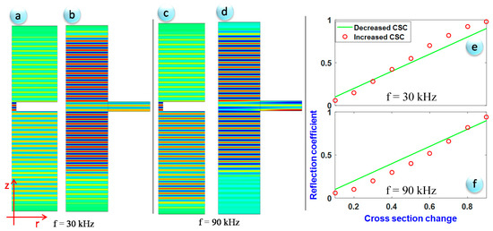 Circumferential displacement distribution: for decreased cross-section change (CSC) (a,c), and decreased CSC (b,d), and reflection coefficient versus CSC in both cases (material loss and added material (e,f)). (r, z) are the radial and axial coordinates of the axisymmetric tube.