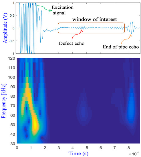 An example of a received signal with its time-frequency representation is given in Figure 8. This signal was obtained with an excitation frequency of 64 kHz using the pulse-echo configuration. The sampling frequency was set at 1 MHz. The signal contains mainly three echoes: the first one, from left to right, corresponds to the excitation, the second one to the defect, and the third one to the end of the tube.